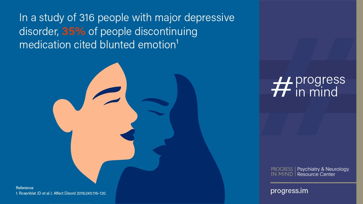 Δυστυχώς, η συναισθηματική άμβλυνση – συμπεριλαμβανομένων της συναισθηματικής αποσύνδεσης, της απώλειας ενδιαφέροντος και ευχαρίστησης – είναι κοινή εμπειρία κατά τη διάρκεια της θεραπευτικής αγωγής, και αναφέρεται σε ποσοστό 30-50% από τους ίδιους τους ασθενείς με κατάθλιψη που λαμβάνουν αντικαταθλιπτική αγωγή.2 Είναι επίσης συχνή αιτία διακοπής της αγωγής. Σε μια πρόσφατη μελέτη στον Καναδά 316 ασθενών με κατάθλιψη, το 35% αυτών που διέκοψαν την αγωγή τους ανέφεραν ως αιτία τη συναισθηματική άμβλυνση.3